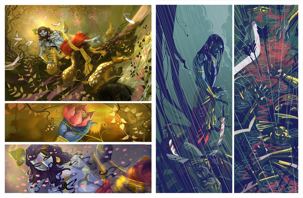 Now in Hinduism, Truth and the Soul are everlasting. For the beautifully designed epic Krishna: A Journey Within, the titular deity is able to see truth in people’s own souls. Even as a happy go lucky child, he faces hardship. Notably when a poisonous multi-headed Naga attacks; rather than just fight it Krishna exposes a truth allowing him to make peace with the serpent. However, this also shows cycles that seem endlessly painful. But the truths, both good and uncomfortable, are something people have to live with. Despite the many fights, Krishna finds love and acceptance in the people and animals he encounters. At times he even sees his past lives and glimpses of the future including his later reincarnation as the Buddha.