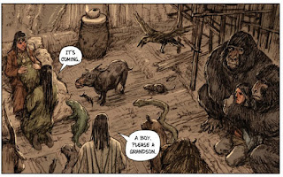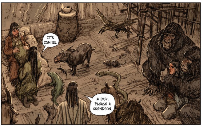 The plot of Noah is a retelling of the biblical epic by the director of psychological thriller Black Swan. It first serves as less than stellar movie with this same plot. The much better comic artwork is the illustrator of Pride of Baghdad. In either case, Noah the prophet’s fantastical world is going to be destroyed in a coming flood. Noah is chosen to oversee a new world by bringing species aboard an ark. Noah’s world is plagued with wars as well as people (including giants) who have lost faith in their almighty creator.
