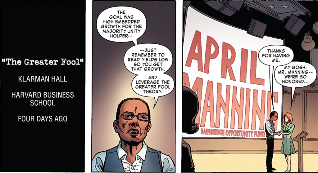 The only reason he is US Agent is because he thinks he’s cleverer than he really is. April believes his influence as a wealthy African American and the traumatic program made him an ubermensch. It is what allows him to get the US Agent copyright among other equipment. In truth, April’s a bootlicker willing to be as ruthless and backstabbing as the corrupt officials he identifies with. To drive that point further, he privatizes some other super soldier assets like an American Kaiju serum while hiding behind bureaucracy. He’s also more than willing to drain a town’s resources and murder people under him. Ironically that’s what connects him with John’s sister Kate.