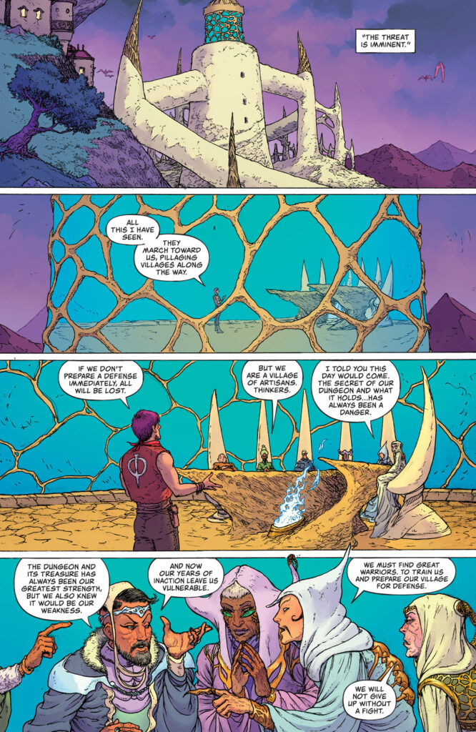 By the next issue, we get a whole crew of memorably distinct personalities. From the well-rounded Ora the Red Sonja stand-in to a pair already secretly in cahoots. They all have the makings of a fantasy quest party but also a heist crew. Because wouldn’t you know it, they’re ready to rob the village blind during the attack. They’re All Terrible indeed.