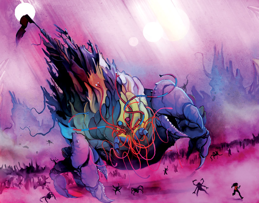 Wait… either Paul Hanley’s stealing this Typist Chimp #23xZ.999’s work, or the simian’s trying to work around the copyright issues of animal-made art. If you look on the credit’s page, you’ll notice that they’re one and the same. Hey, it’s more convenient to buy grasshopper products at your supermarket with your own money. I just wonder if this chimp has to deal with that English drummer’s lawyers.